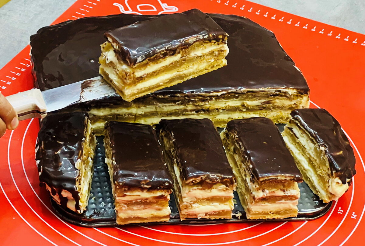 Для теста потребуется 390 г муки, 200 г сливочного масла, 0,5 чайной ложки соли, 0,5 чайной ложки пищевой соды и 1 столовая ложка яблочного уксуса. Эти ингредиенты замешиваются в однородное тесто, затем делится на 6 частей, каждая из которых раскатывается в тонкий пласт. Следующий шаг — выкладка двух слоев теста с яблочной начинкой между ними и выпекание при 180 градусах на протяжении 15 минут. В итоге получается три коржа, которые после охлаждения необходимо смазать кремом, а затем покрыть глазурью.