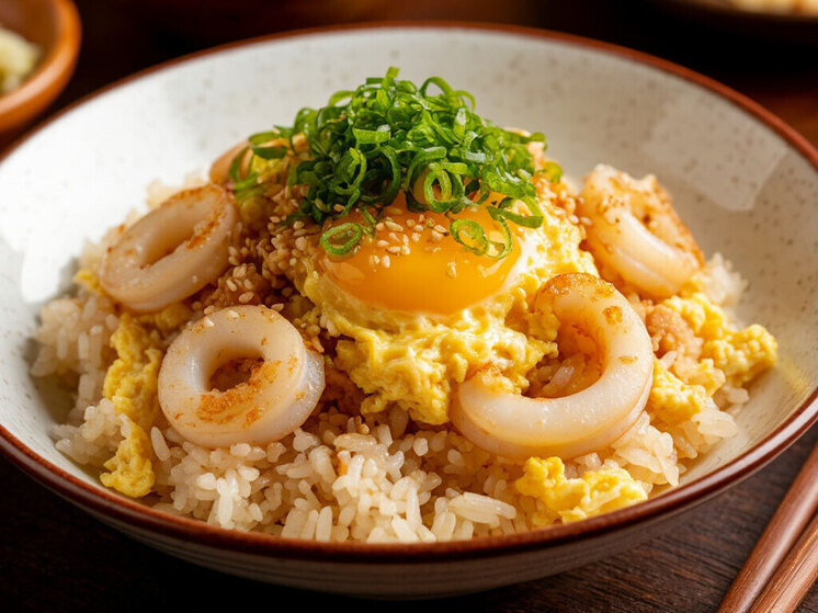- Финальная сборка: Обжарьте лук и морковь до золотистого цвета, добавьте к ним кальмары и жарьте 2–3 минуты. В заключение соедините все компоненты: рис, жареные яйца, влейте соевый соус и добавьте зелень. Перемешайте и подогрейте 2–3 минуты.