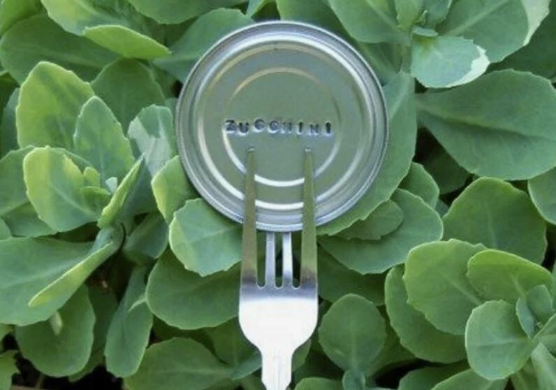 - Металлические ярлычки: вырезая полоски из жестяных банок, можно создать уникальные и стильные маркеры. Подписывайте их с помощью гвоздя или шила, чтобы буквы были рельефными.