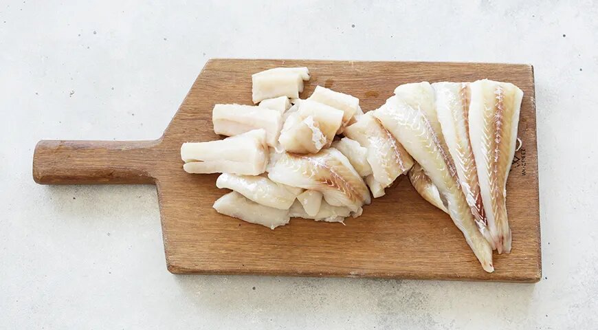 Если филе заморожено, его следует разморозить. Для ускорения процесса можно использовать метод с холодной водой. Затем филе нарезается на небольшие кусочки, заодно удаляя все косточки.