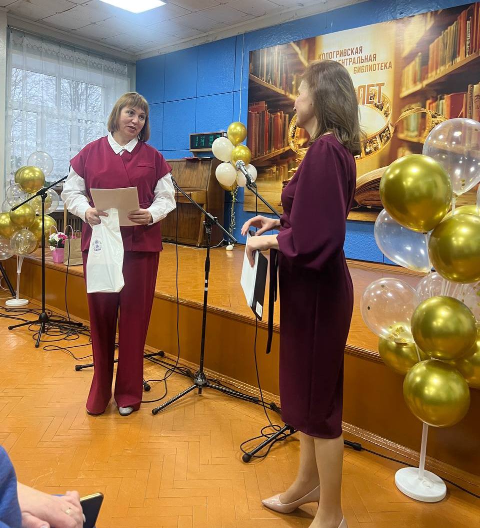 На торжественном мероприятии, посвященном юбилею, председатель территориальной избирательной комиссии Кологривского округа Татьяна Смирнова вручила Благодарность председателя избирательной комиссии Костромской области директору МБУК «Кологривская централизованная библиотечная система» Елене Всемирновой. Награда вручена за большой личный вклад в организацию и проведение работы по повышению правовой культуры избирателей на территории муниципального округа.