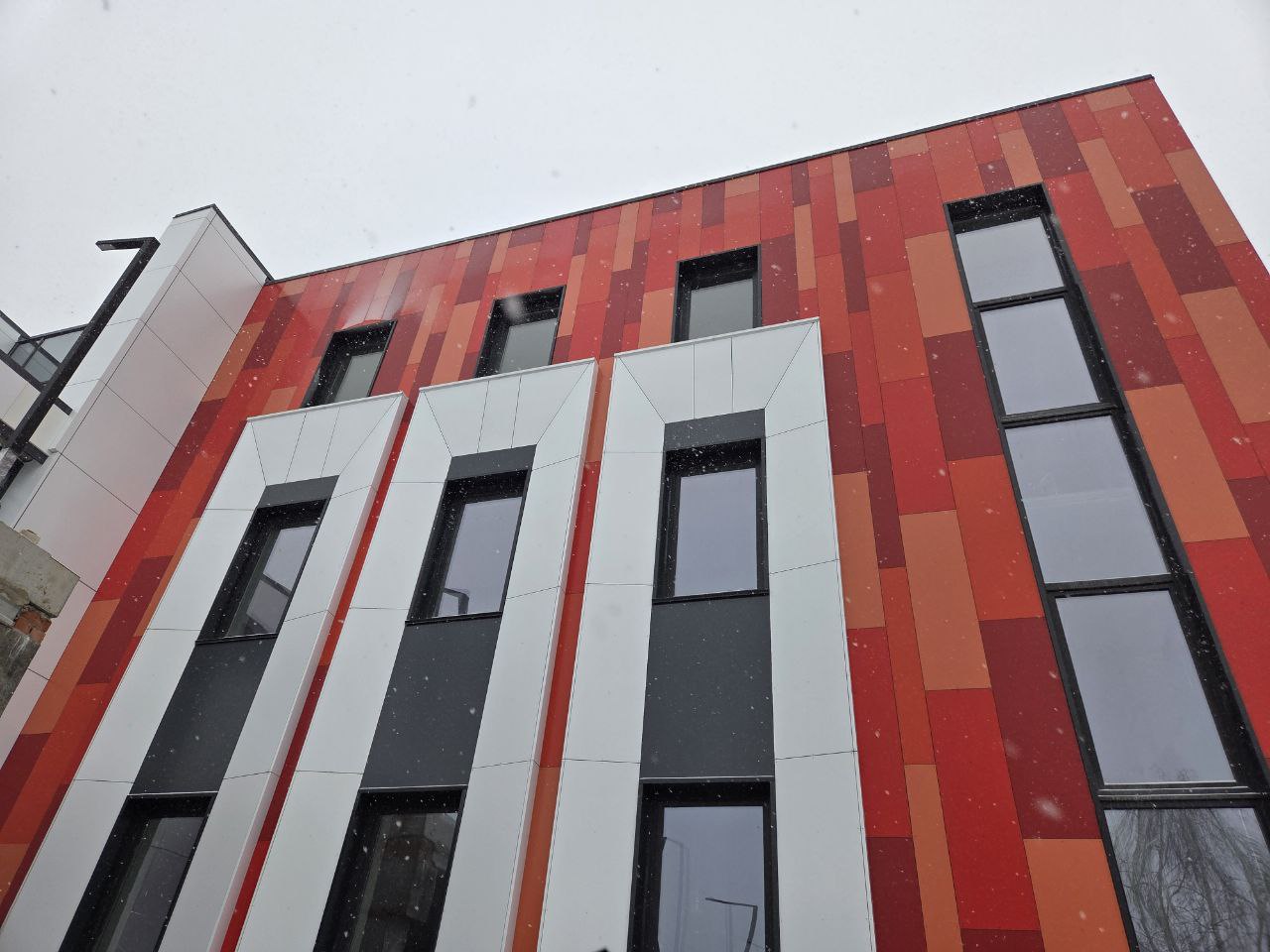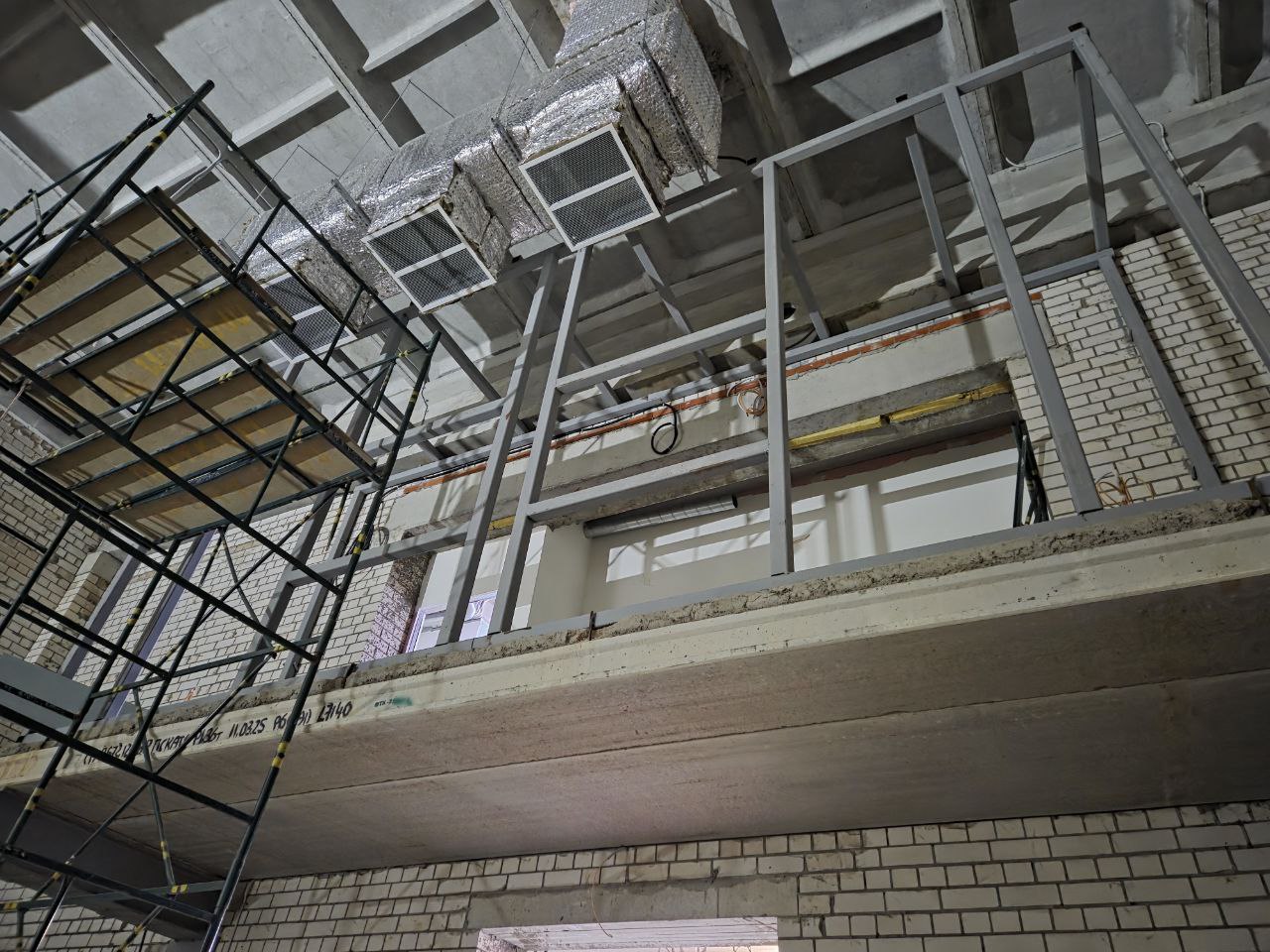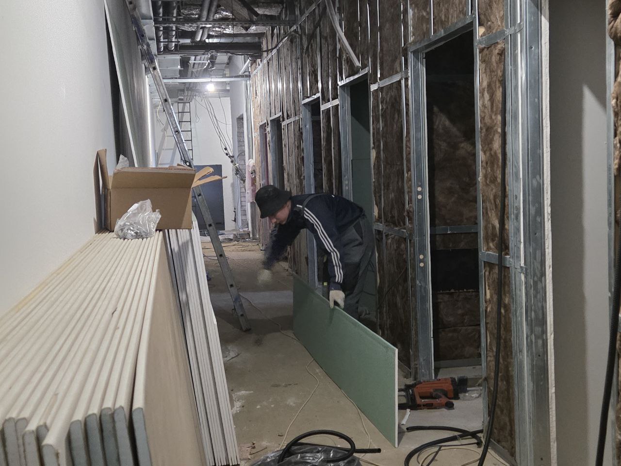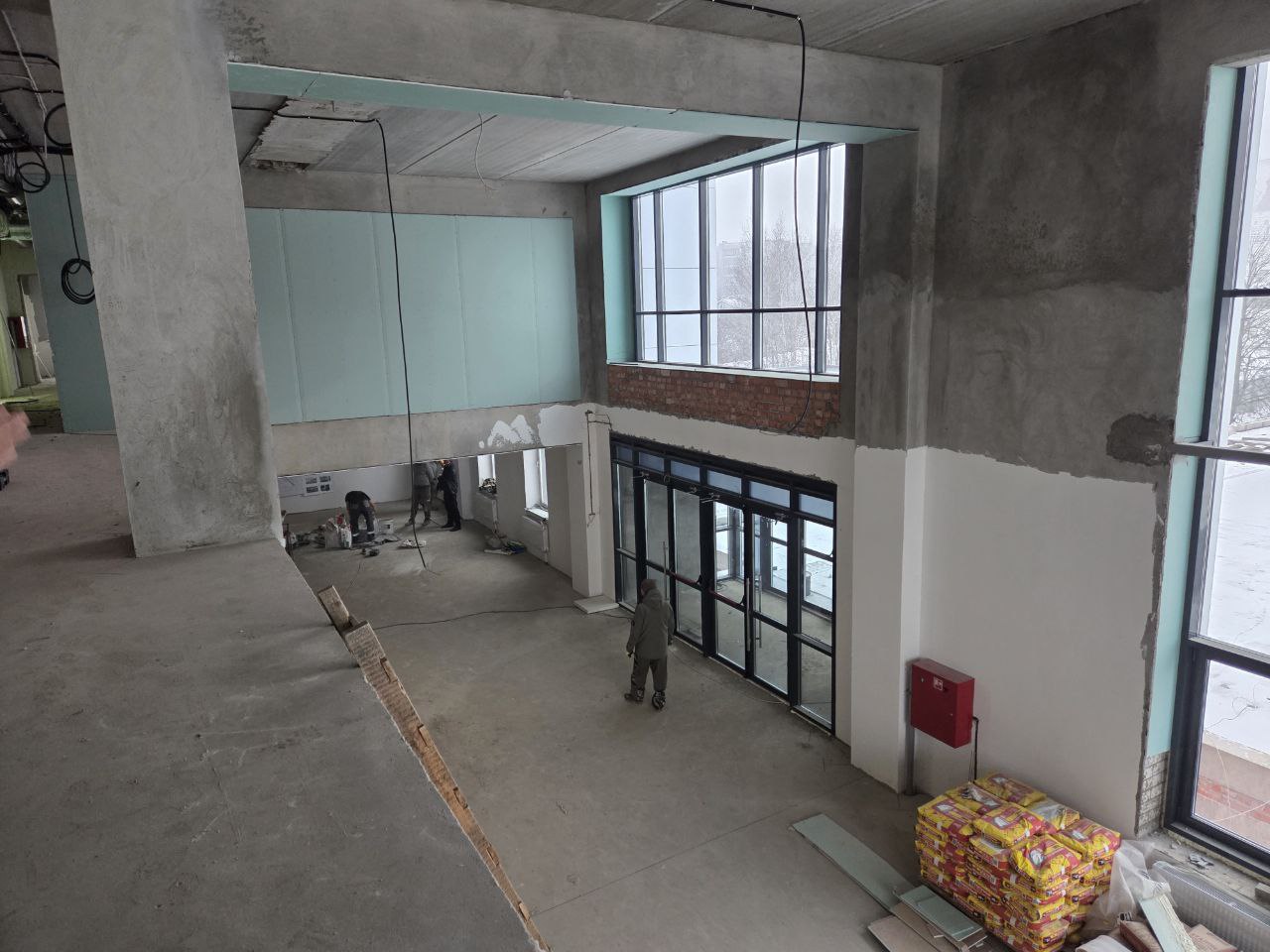 Часть бригад завершает устройство фасадов. Часть – работает на прилегающей территории и входных группах. Само здание уже с отоплением, поэтому к работам приступили отделочники. Также завершается монтаж сетей электроснабжения. До нового года здесь должен появиться свет.