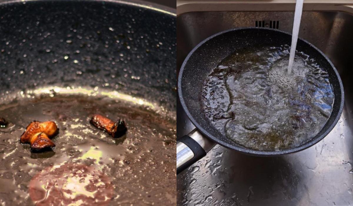 Если на сковороде остались жир или остатки мяса, повторите процесс, добавив немного средства для мытья посуды. Такая простая техника может поразить своей эффективностью!