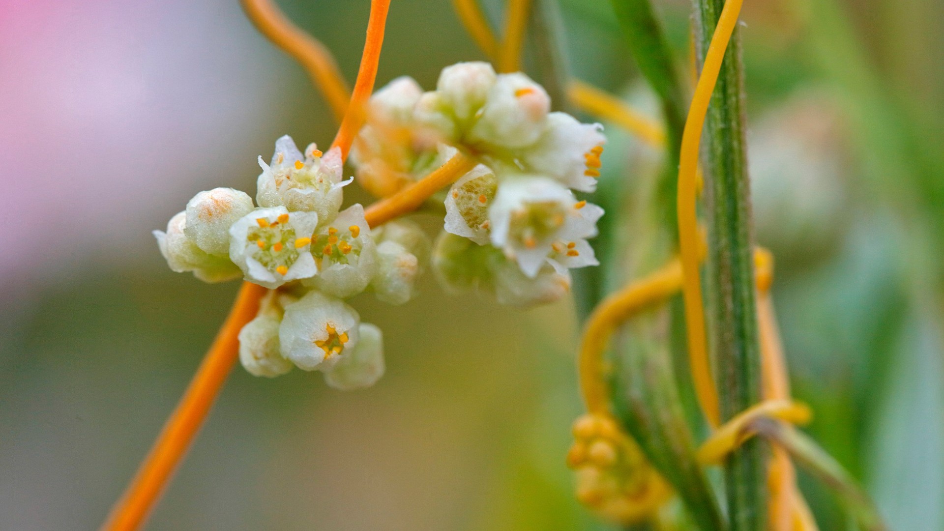Такое растение-паразит называется повилика. У него нет ни корней, ни листьев — только очень длинные нитевидные стебли. С их помощью она обвивается вокруг своих зеленых «соседей» и присасывается, питаясь их соками. Пораженные повиликой посадки спасти невозможно.
