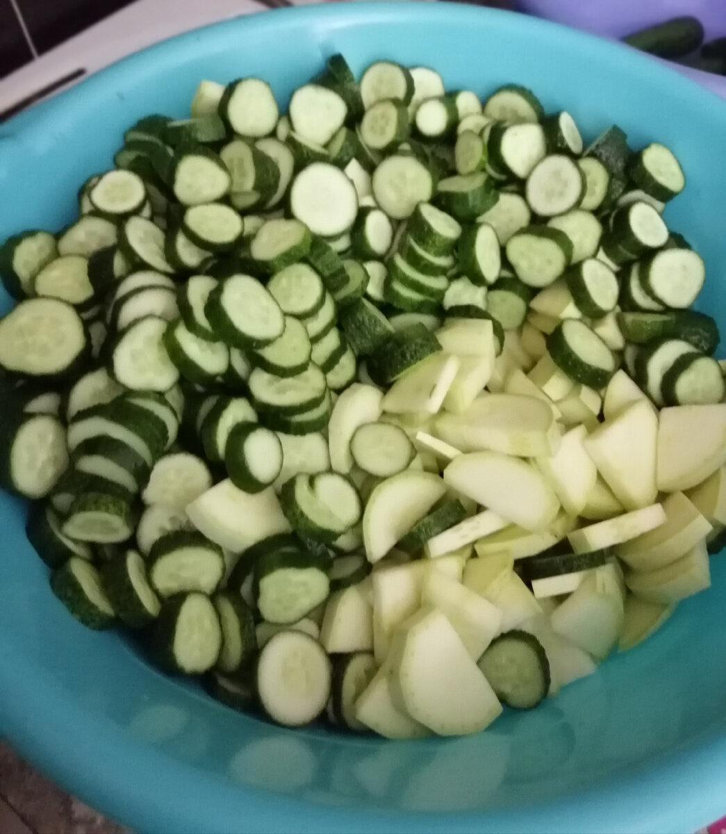 - Сначала нарезайте огурцы и кабачки кольцами или полукольцами — в зависимости от толщины. Чем тоньше, тем быстрее они замаринуются.