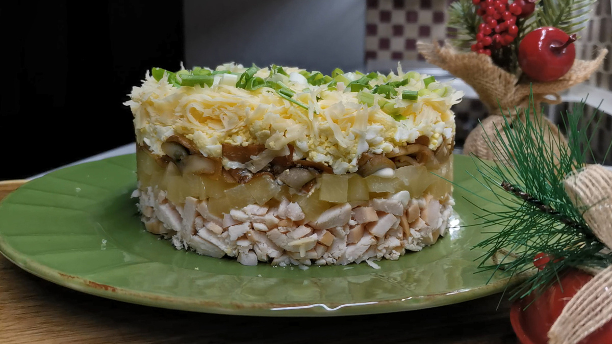 При приготовлении важно не просто нарезать ингредиенты, но и правильно компоновать их слой за слоем. Начинайте с куриного слоя, затем добавьте ананасы, грибы, яйца и сыр. Каждый слой слегка утрамбовывается и покрывается сеточкой из майонеза, что делает салат более сочным и аппетитным. На финал посыпьте его свежим зеленым луком для яркости и легкой остроты.
