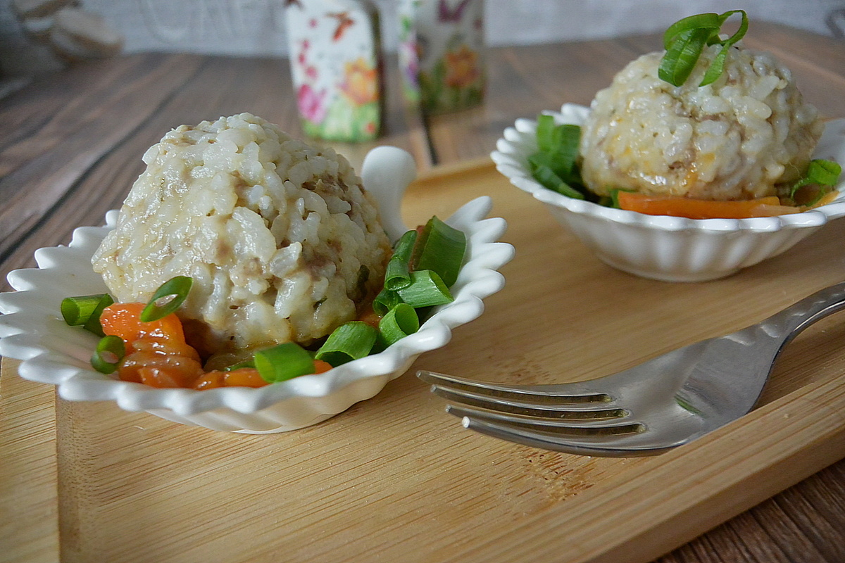Первым делом тщательно смешивают фарш с отваренным до полуготовности рисом, чтобы добиться однородной массы. Затем в эту смесь добавляют яйцо, солят, перчат и вносят специи по вкусу. В это время лук нарезают полукольцами, а морковь — соломкой, после чего обжаривают их вместе в растительном масле до золотистого цвета. К овощам добавляют кетчуп, чтобы придать особую вкусовую гамму.