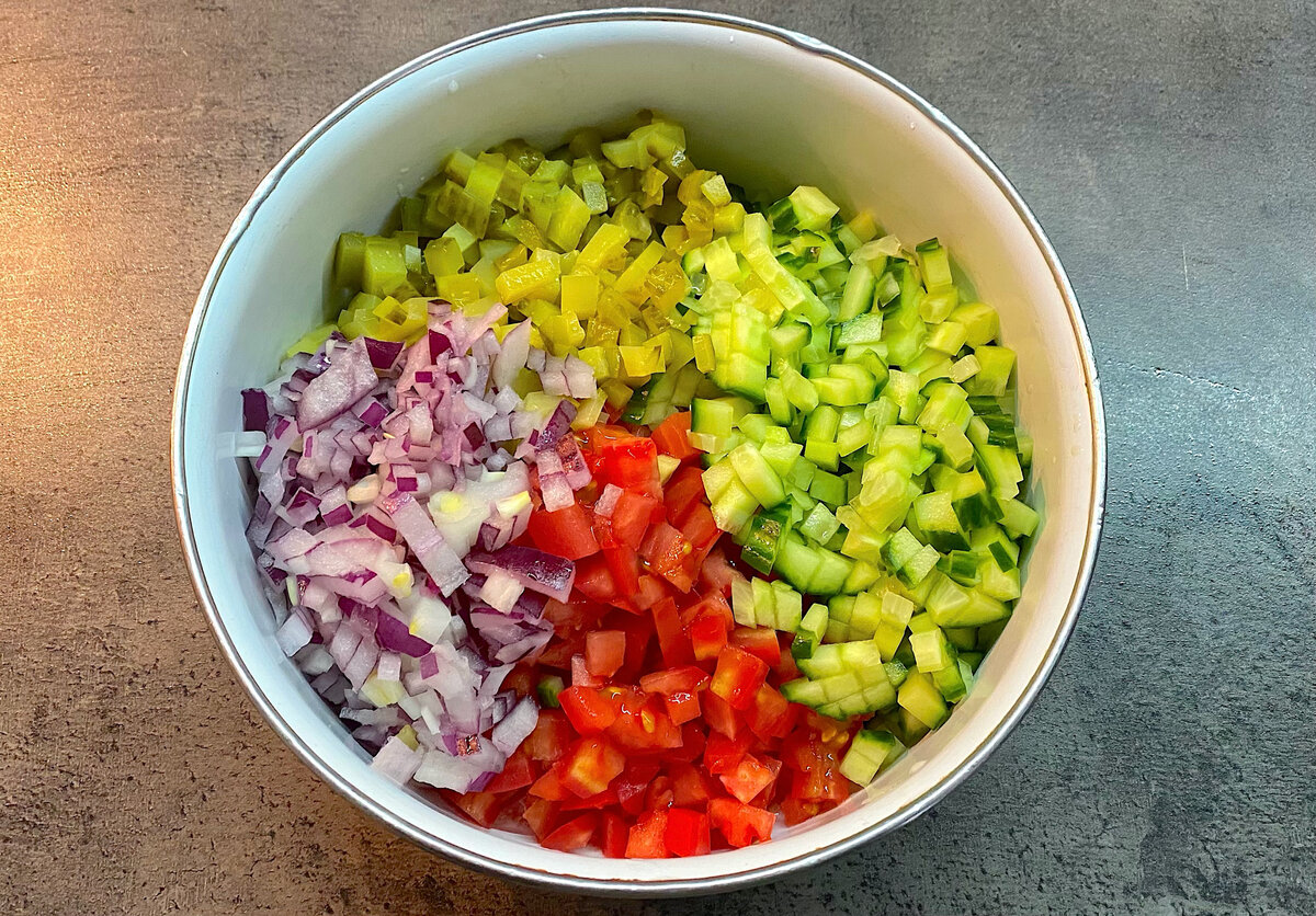 Перв шаг в создании идеальной шавермы — подготовка ингредиентов. Лук можно замариновать, чтобы он не был слишком резким. Для этого нарежьте лук, добавьте к нему столовую ложку сахара и уксуса, и залейте кипятком. Оставьте на 5 минут, затем слейте воду, сообщает канал "Домохозяйка со стажем Галина".