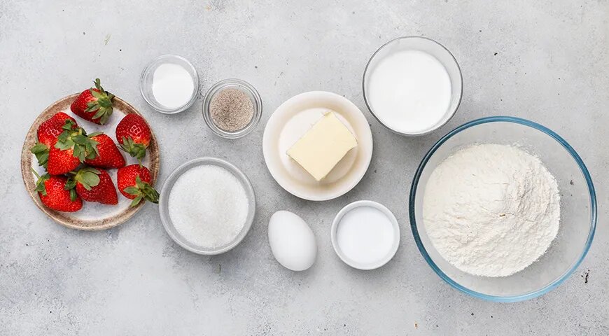 4. Подготовьте клубнику: удалите чашелистики, тщательно промойте и обсушите. Крупные ягоды разрежьте, мелкие оставьте целыми. Выложите клубнику равномерно по поверхности теста, не вдавливая их.