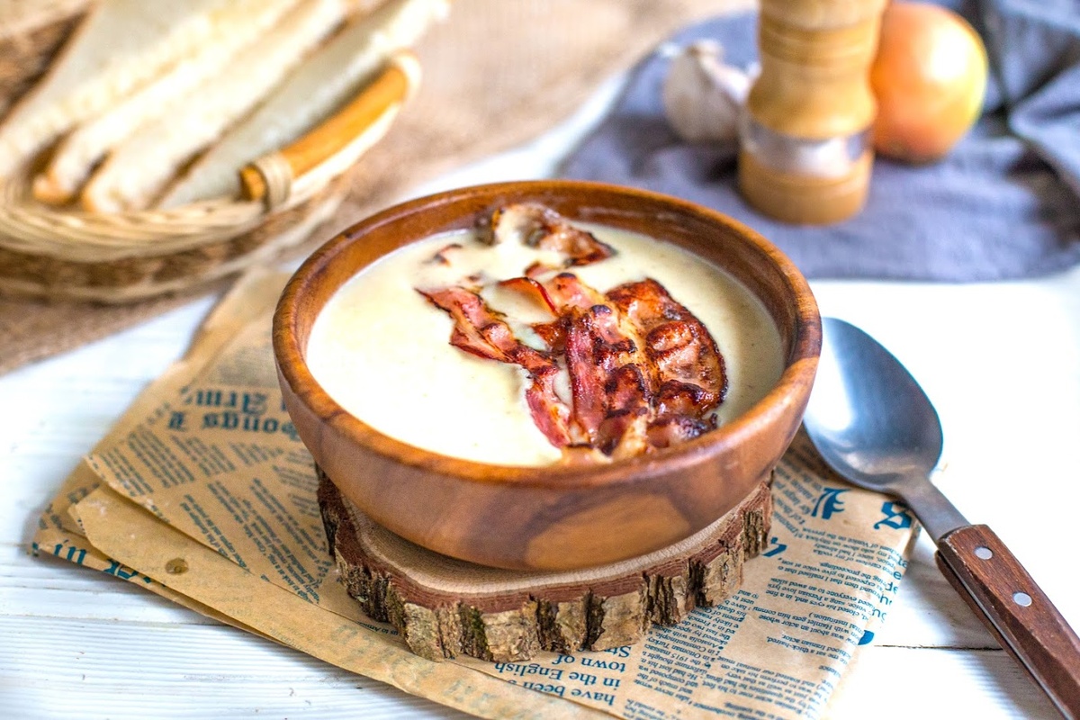 Шаг 3: В той же сковороде с небольшим количеством растительного масла на среднем огне обжарить лук и чеснок до золотистого цвета. Затем добавляют картофель, бекон и молотый кориандр, заливают горячим бульоном и готовят 15-20 минут. В завершение добавляются сливки и сыр, всё тщательно смешивается блендером до получения однородной массы. Блюдо подается горячим, оформленным crispy беконом.