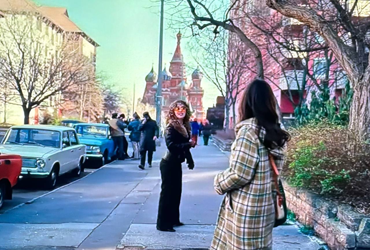 Сериал полон отборной «развесистой клюквы». Тут тебе и агенты ЦРУ, уходящие от погони на «Жигуленке» от КГБистов на «Волгах». Тут тебе и барахолки, явно взятые из 90-х и уж точно не из 70-х. Тут тебе и декабрьская Москва с зелеными листьями (прямо как в 2025-м!). Тут тебе и советские демонстрации, и затрапезная улочка, упирающаяся в одинокий Храм Василия Блаженного - и куда только Красная площадь делась? И это я только одну серию успел глянуть!