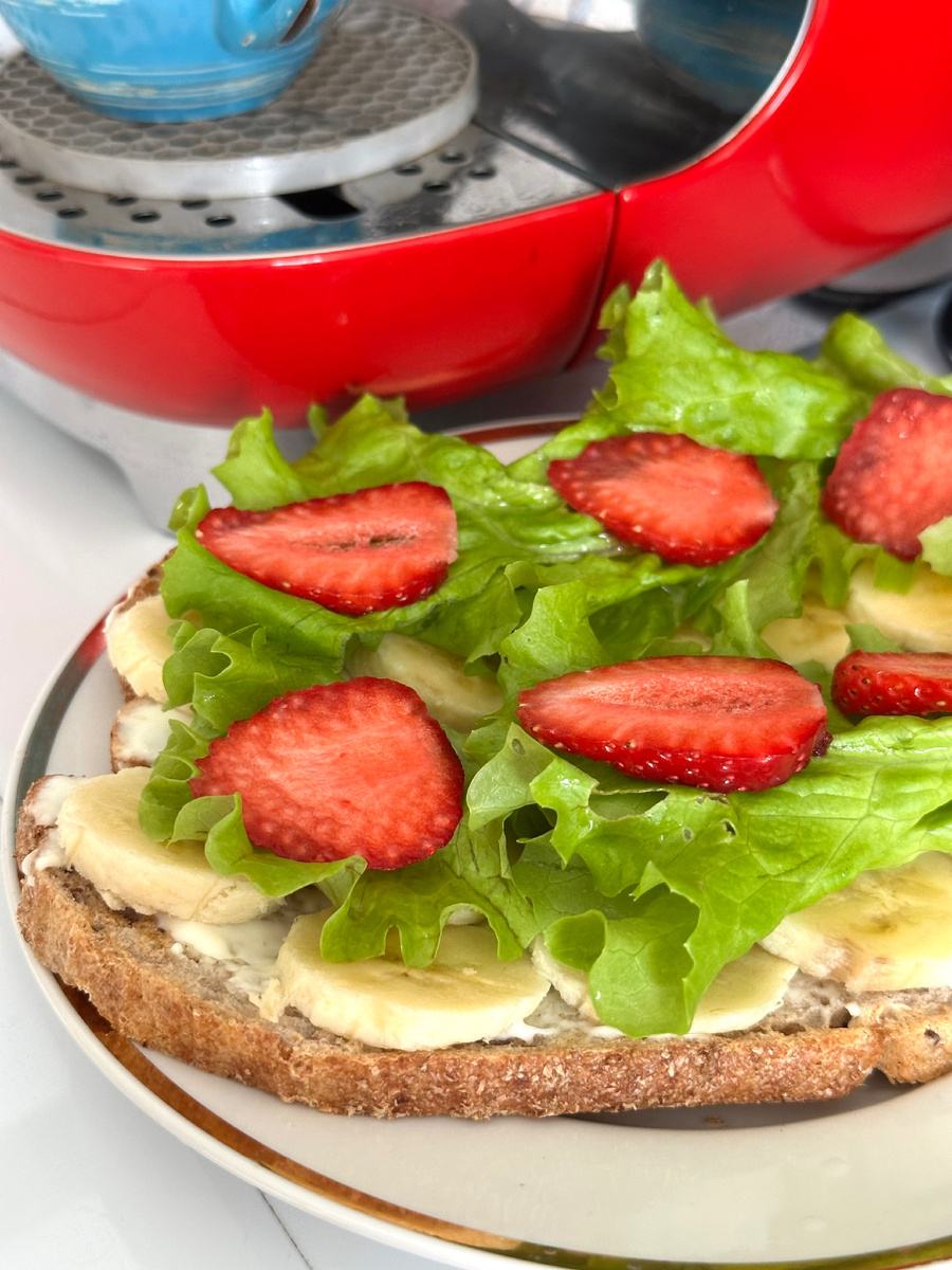Композиция состоит из полбяного цельнозернового хлеба с домашним плавленым сыром, на который размещаются ломтики банана и клубники, а все это оформлено свежими салатными листьями. Звучит необычно, но многие уже успели оценить это сочетание как восхитительное!