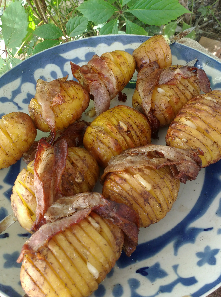 Для начала картофель следует насадить на шампуры и сделать аккуратные надрезы шириной около 0,5 см. Это позволит специям лучше пропитать клубни и сделать их более ароматными. Дальше, нарезав чеснок на пластины, нашпиговать клубни между надрезами, чтобы каждый кусочек стал настоящим вкусовым взрывом.