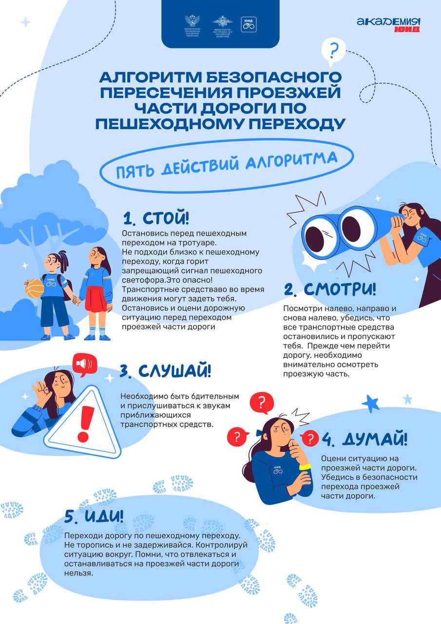 Пешеходный переход — это место, где требуется повышенное внимание и концентрация. Чтобы дорога оставалась безопасной, запоминайте простой алгоритм из 5 шагов: