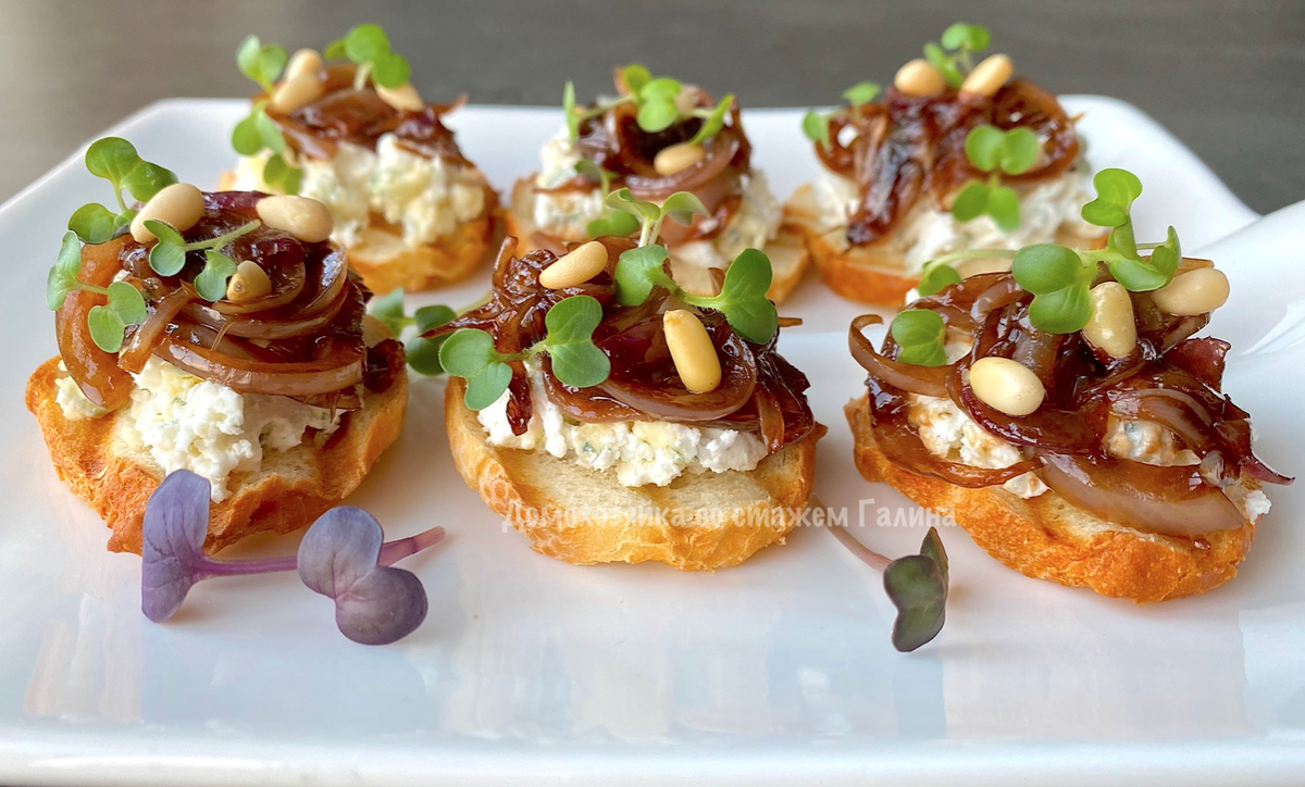 Для основы отлично подойдет багет, который следует нарезать на тонкие ломтики и подсушить на гриле или в тостере. На поджаренный хлеб намазывается сырная масса, после чего сверху выкладывается ранее приготовленный луковый чатни. Для финального штриха можно украсить закуску кедровыми орехами и микрозеленью, а при желании добавить чуть-чуть меда.