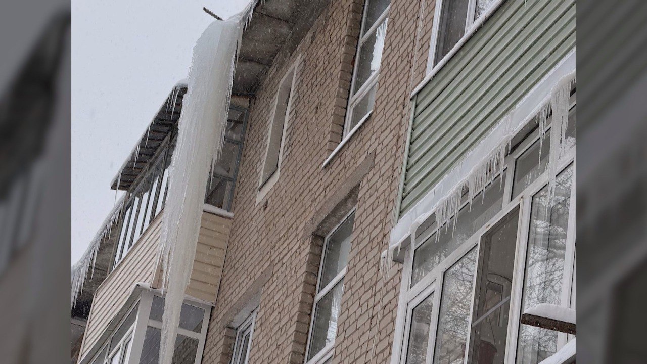 Например, вот такая картина в одном из населенных пунктов Костромского района. Ледяная глыба длиной два этажа свисает с многоэтажки.