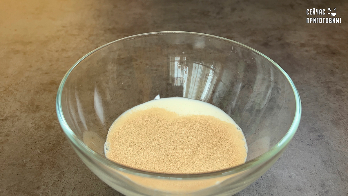 - В глубокой миске смешать 100 мл теплого молока с ложкой сахара и 8 г сухих или 25 г свежих дрожжей.