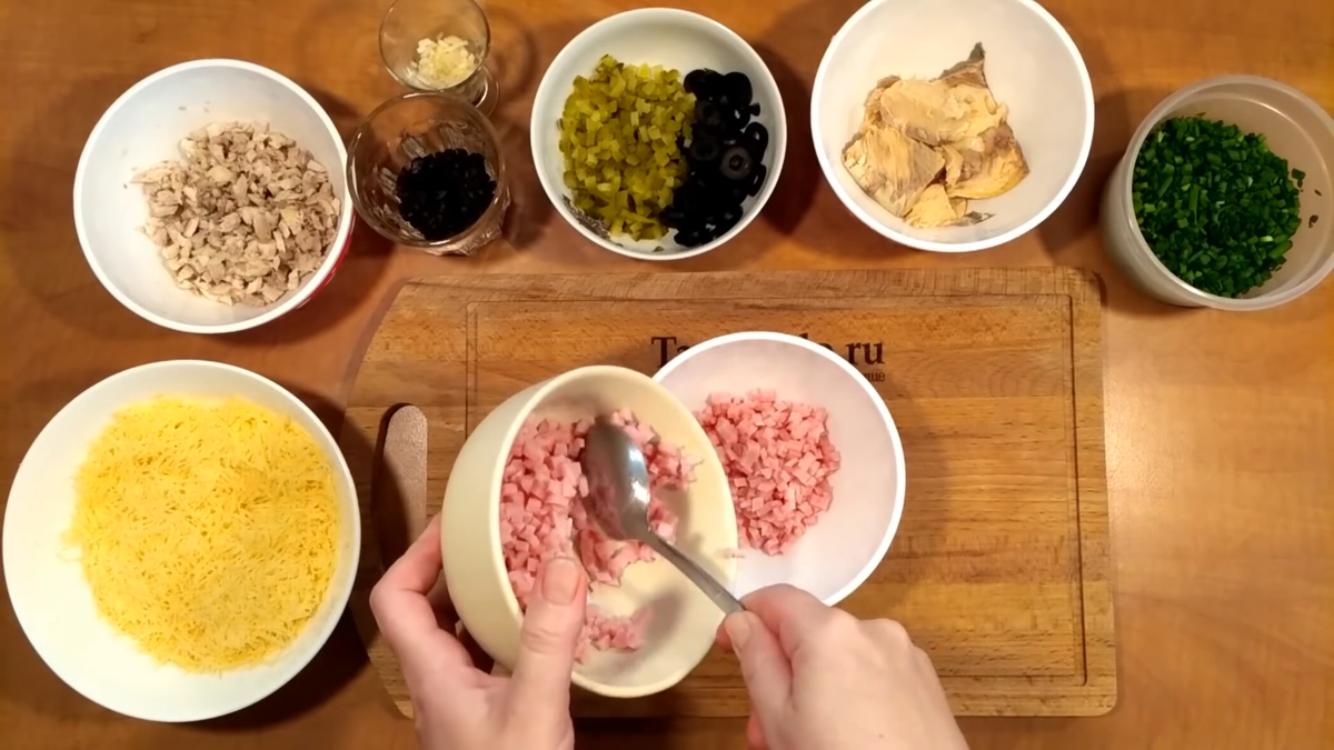 Каждая из начинок требует мелкой нарезки ингредиентов или использования терки. Для начала, сыр натирается на мелкой терке, остальные составляющие нарезаются маленькими кусочками.