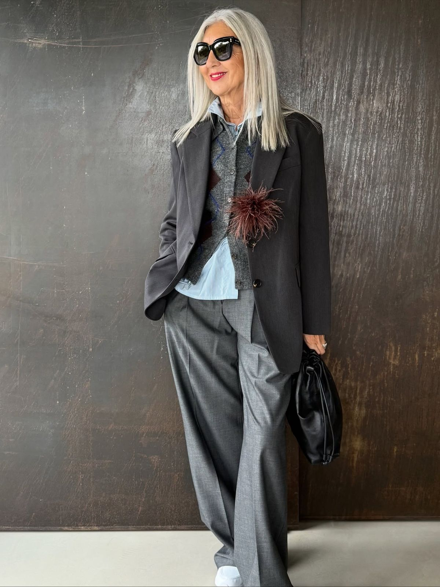 - Индивидуальный подход. Даже в зрелом возрасте можно оставаться уникальной. Женщина может выглядеть стильно в плиссированном платье, кроссовках и жакете, сохраняя свою индивидуальность и чувство вкуса.