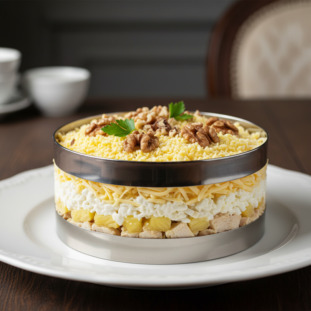 Салат «Дамский каприз» стал настоящим фаворитом на праздничных столах благодаря своему изысканному вкусу и яркому оформлению. Сочетание куриного филе, сладких ананасов и нежного сливочного сыра делает это блюдо великолепным комплиментом для любой хозяйки. Приготовьте его, и он станет одним из главных украшений вашего стола на любом торжестве!