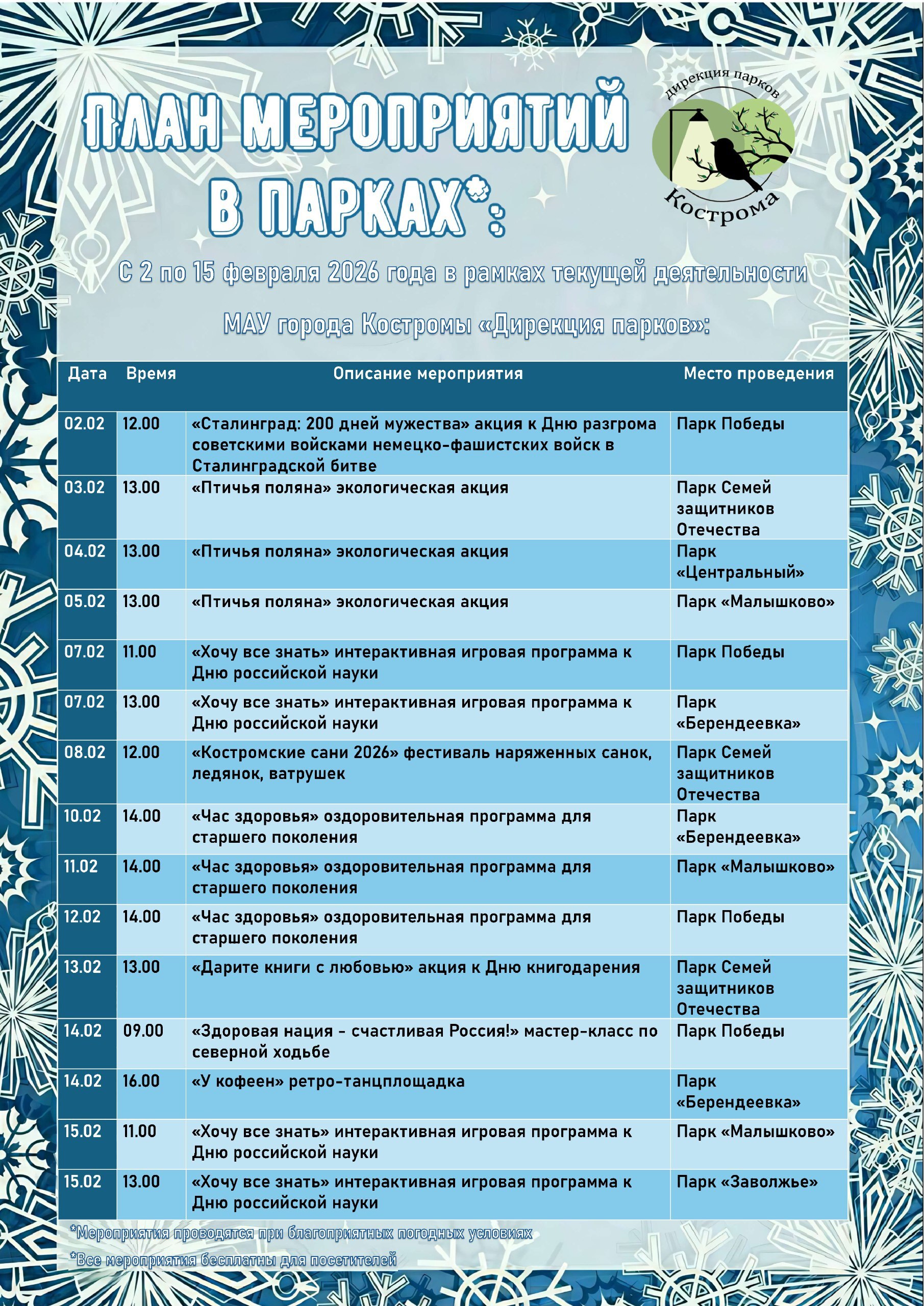 Эта неделя в городских зонах отдыха начнется с акции «Птичья поляна». В субботу 7 февраля «Дирекция парков» предлагает отметить День российской науки. А в воскресенье 8 февраля парк Семей защитников Отечества в 12:00 украсит шоу «Костромские сани 2026».