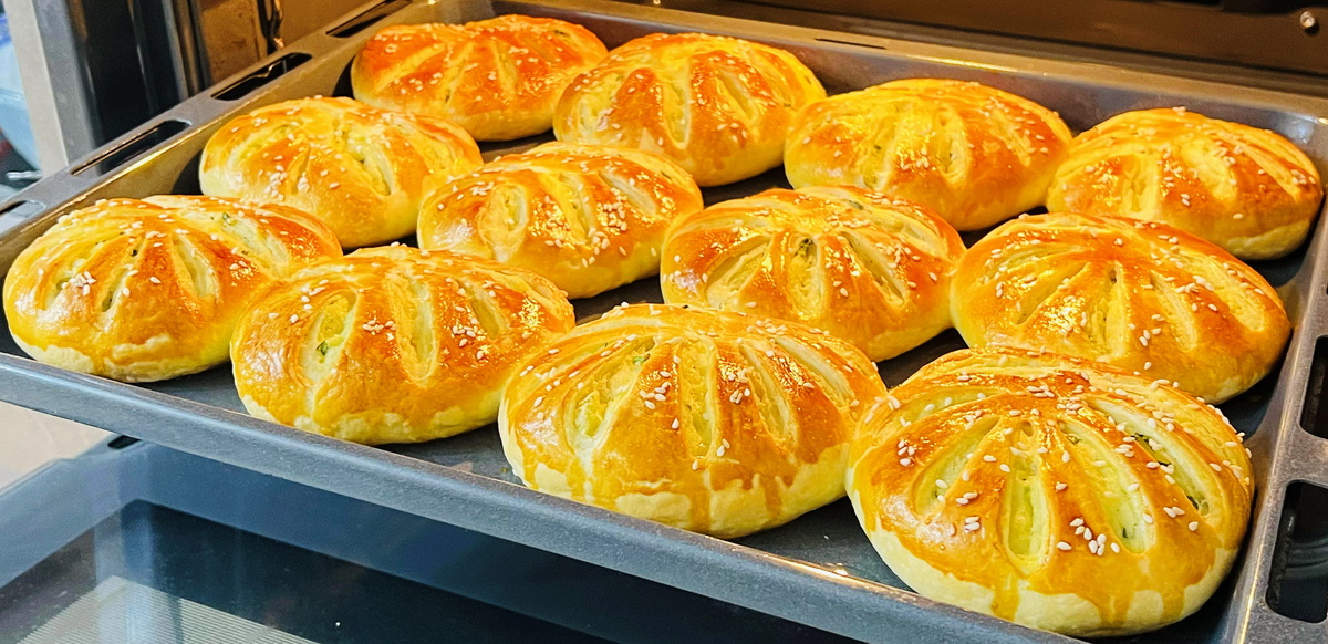 Затем, сворачивая края, сформируйте мешочки, придавая им круглую форму. Легко придавите сверху и сделайте несколько надрезов. Выложите на противень, смазанным растительным маслом, обмажьте желтком и посыпьте кунжутом. Выпекайте в разогретой до 180 градусов духовке от 25 до 30 минут.