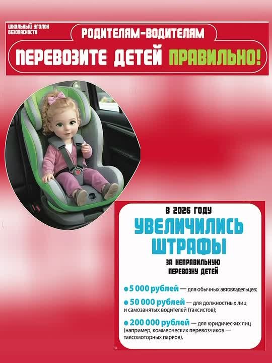 Школьный уголок безопасности: полезная памятка-плакат для родителей об изменениях в правилах перевозки детей в 2026 году