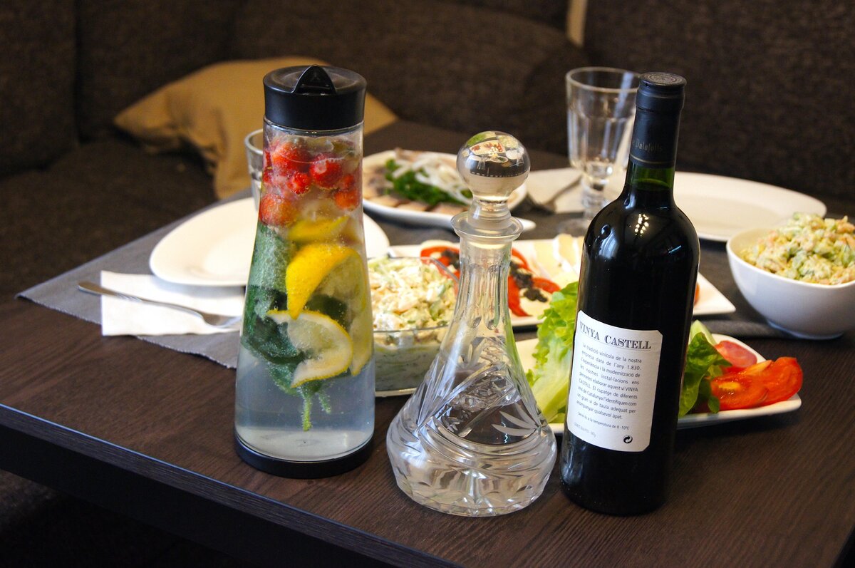 На столе разместились разнообразные закуски, которые будут не только вкусными, но и атмосферными. Первым номером предстал классический салат с маринованной селедкой и луком — это бесспорный фаворит на любом застолье, гармонично сочетающийся как с вином, так и с чаем. Кроме того, сыр с белой плесенью стал великолепным дополнением к столу, который, к сожалению, остался без традиционного винограда для полного вкусового калейдоскопа. Адыгейский сыр с помидорами и соусом песто — это еще одна непременная закуска, которая часто оказывается на праздничных мероприятиях, благодаря своему изысканному вкусу и простоте в приготовлении.