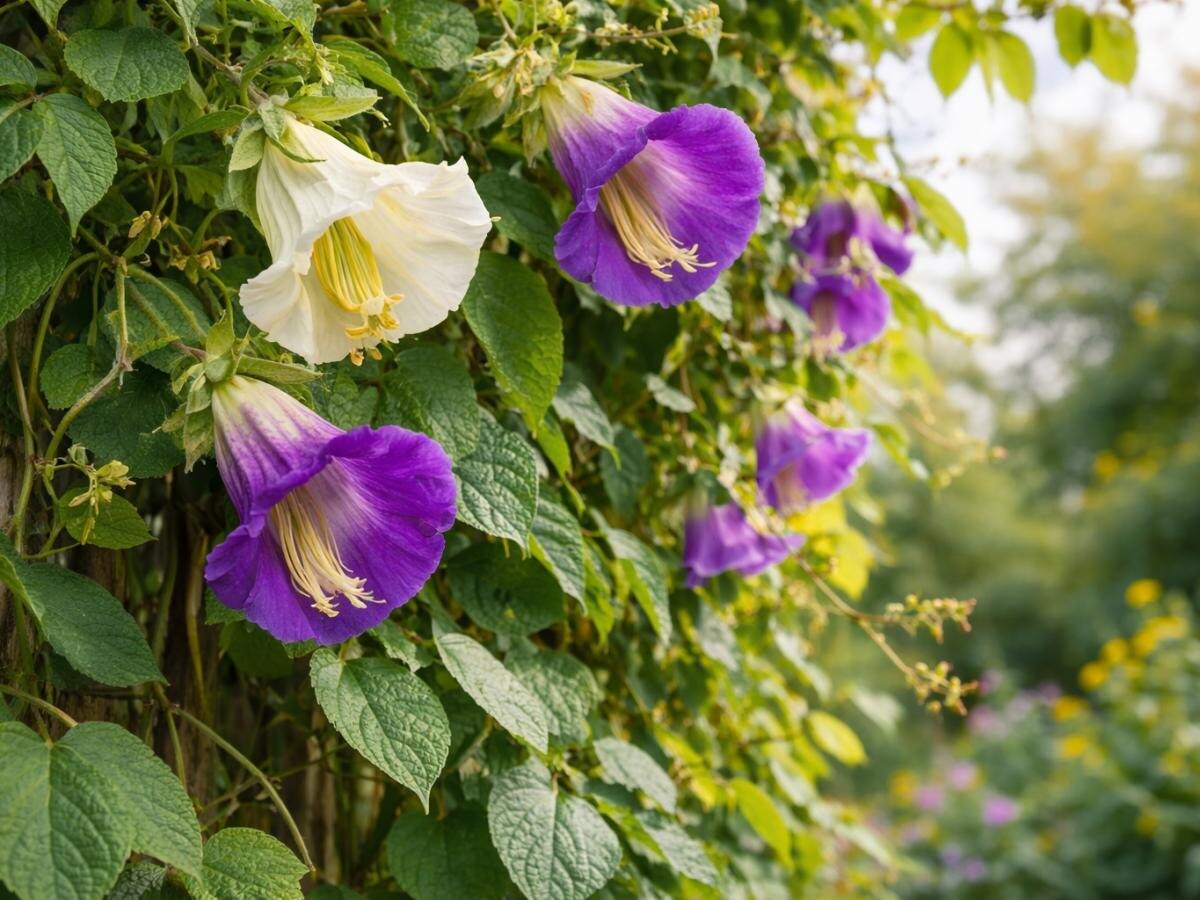 - Кобея: Этот быстрорастущий сорт поднимается до 4 метров, образуя плотный зеленый занавес. Крупные колокольчики цветут до заморозков, создавая эффектный визуальный акцент в саду.