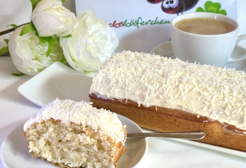 Сначала взбейте яйцо с сахаром, затем соедините жидкие ингредиенты: кокосовое молоко, растительное масло и сироп. Осторожно вмешайте просеянную смесь муки с разрыхлителем. Тесто вылейте в форму и выпекайте до сухой зубочистки. После остывания смешайте сливки с сахарной пудрой — и можно стянуть верх кремом, посыпав кокосовой стружкой.