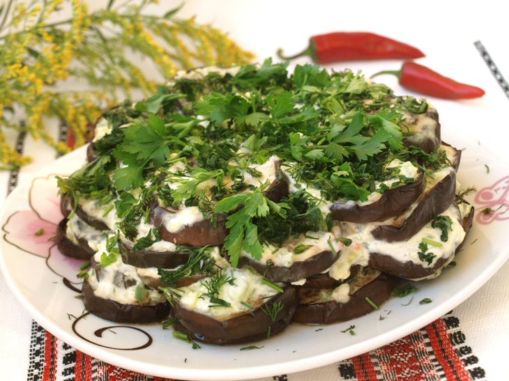 Теперь соберем нашу закуску: в контейнер или подходящую форму выкладывайте баклажаны слоями, каждый из которых промазывайте соусом и посыпайте зеленью. Уплотняйте слои и накройте контейнер крышкой. Уберите в холодильник минимум на 3–4 часа, чтобы закуска пропиталась ароматами.