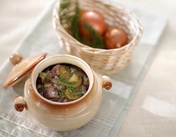 Далее порционные горшочки ополаскиваются водой. На дно укладывается нарезанный картофель, затем следует слой из огурцов и обжаренного лука. Не забудьте добавить черный перец. Затем аккуратно выложите в горшочки обжаренное мясо и залейте все это сухим белым вином. При необходимости долейте немного воды, чтобы она полностью покрыла мясо. Укроп также вымывается, обсушивается и добавляется в горшочки.