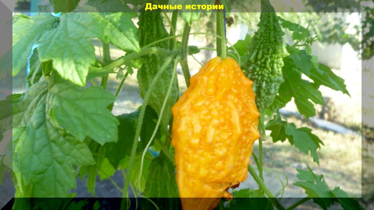 Момордика порадует любителей экзотики своими цветами и плодами. Листья растения напоминают арбузные, а во время цветения и плодоношения он становится настоящим украшением: лианы обвивают заборы, арки, создавая таинственную атмосферу. Плоды меняют цвет от желтого до ярко-оранжевого, а при достижении спелости могут трескаться, освобождая семена на землю.