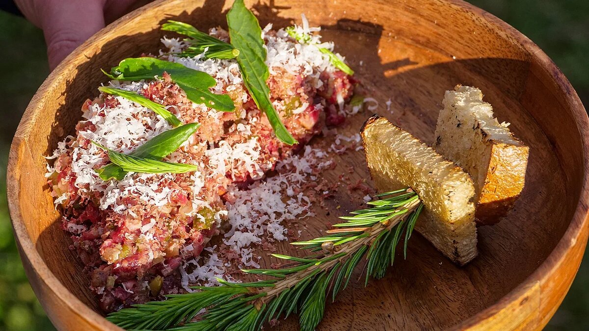 На углях обжариваются кусочки белого хлеба. Мясо нарезается мелким кубиком и помещается в миску, добавляются нарезанные корнишоны и посоленный лук, несколько капель острого соуса, а также оливковое и тыквенное масла. Все ингредиенты тщательно перемешиваются, после чего тартар выкладывается на тарелку и сверху посыпается вяленой олениной и тертым пармезаном. Блюдо можно украсить листочками щавеля и маринованными побегами лиственницы.