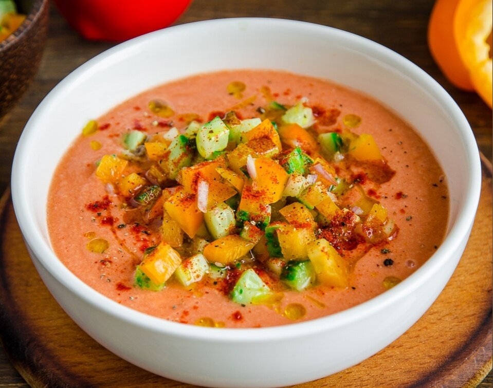 Приготовленный гаспачо можно оставить на пару часов в холодильнике для настаивания, но если кубики льда добавлены, он уже будет охлажденным и освежающим. Для подачи налить томатную основу в тарелку, добавить немного хрустящих овощей, сбрызнуть оливковым маслом и присыпать копченой паприкой, создавая яркие акценты. Немного черного перца завершит оформление блюда.