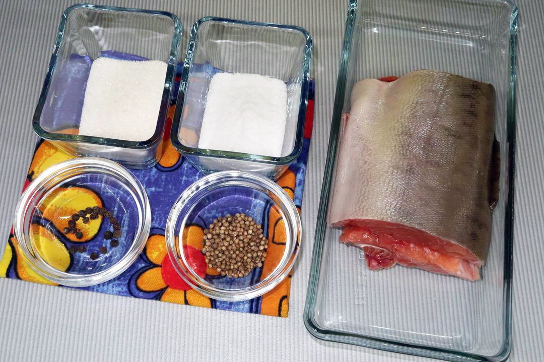 На тарелке нужно смешать соль и сахар. Затем тщательно обвалять рыбу в этой смеси, уделив особое внимание всем её участкам. Чтобы специи лучше впитались, можно слегка втереть соль с сахаром в кожу рыбы.