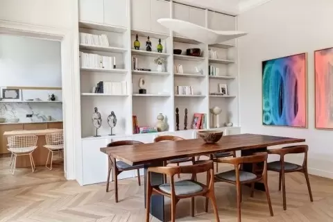 Идея объединить традиционные элементы с современными трендами пользуется популярностью. Камин может стать центром притяжения в столовой, а строгая минималистичная мебель, хрустальная люстра и картины в рамках привнесут в атмосферу ностальгии.