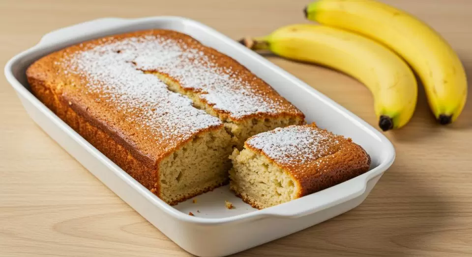 Как только пирог готов, дайте ему немного остыть, посыпьте сахарной пудрой или переверните на блюдо так, чтобы бананы оказались сверху. Этот банановый шедевр получился очень нежным, с легкой сладкой корочкой. Простой в приготовлении, этот десерт идеально подходит даже для самых загруженных дней, ведь в нем нет необходимости использовать миксер.