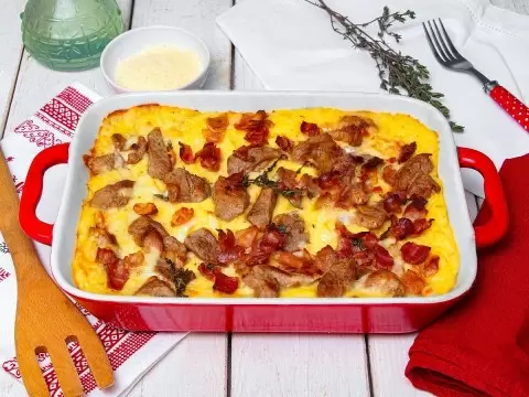 После того как картофельное пюре пропеклось, качество блюда можно улучшить, добавив нарезанный кубиками бекон и свиную вырезку. Запекать ещё 10 минут до появления аппетитной корочки. Запеканку лучше подавать горячей для максимального вкуса.