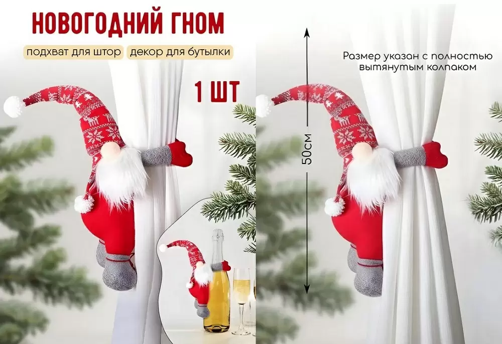 Кому не хочется, чтобы в их доме жил настоящий гном? Новогодний подхват для штор в виде этого уютного существа станет ярким акцентом на вашем окне. Изготовленный из мягкого фетра и искусственного меха, он смотрится не только симпатично, но и с пользой удерживает шторы, оставляя подоконник свободным для гирлянд. А когда шторы не нужны в поддержке, гном легко переместится на полку или даже станет забавным аксессуаром на бутылке шампанского.