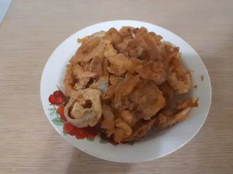 Далее необходимо приготовить кляр. Для этого в миску добавляют муку, разбивают яйца, солят и тщательно перемешивают до получения однородной массы. В конце добавляются нарезанные кольца лука, которые тоже обваливаются в кляре, придавая им особую хрустящесть.