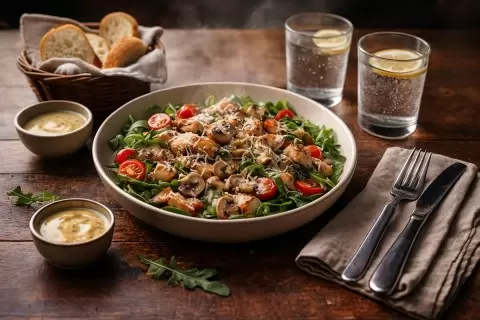 4. Финальный аккорд: На столе собрать салат: выложить зелень, тёплую курицу, горячие грибы, помидоры и заправить. Не забудьте посыпать тёртым сыром и перемешать — это создаёт настоящий эффект!