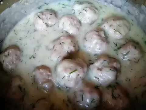 После 5 минут остывания аккуратно вмешать сливки и приправить по вкусу. Залить горячие фрикадельки нежным соусом и подавать к столу. Приятного аппетита!