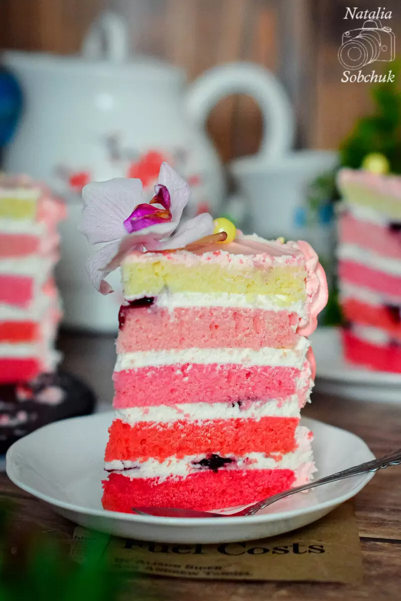 Для получения четырех оттенков розового, нужно разделить тесто на несколько частей и добавить краситель. Бискветы выпекают в разогретой духовке около 15 минут, проверяя готовность деревянной палочкой. После выпекания следует остудить коржи на решетке.