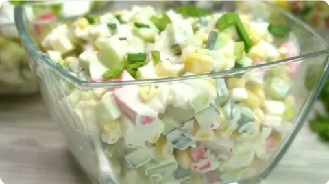 Сначала нужно нарезать огурцы и вареные яйца кубиками, а крабовые палочки – также мелко нарезать. Все ингредиенты смешиваются в глубокой миске и заправляются майонезом.