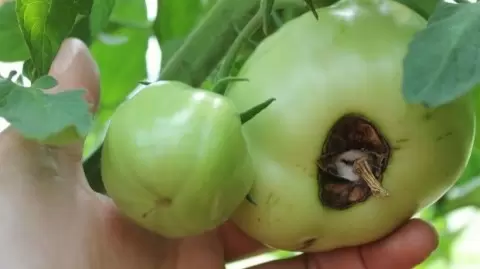 Первые симптомы гнили проявляются в виде темных пятен, образующихся на томатах в местах, где располагались цветы. Чаще всего такие повреждения выглядят сухими, а в редких случаях могут быть и мокрыми. Как только проявляется вершинная гниль, плоды становятся непригодными для еды, и, к сожалению, их уже невозможно спасти.