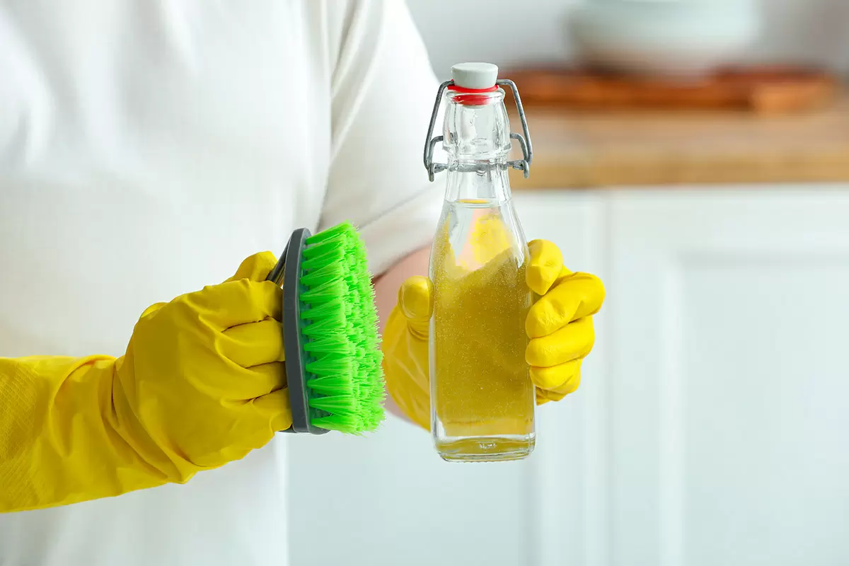 - Белый уксус: Этот секретный ингредиент является высокоэффективным средством для чистки. Для его использования нужно смешать равные части уксуса и теплой воды. Полученный раствор распыляется на плитку и оставляется на 15 минут. После этого остатки загрязнений можно легко удалить с помощью губки или тряпки. Важно помнить о том, что уксус не подходит для мраморных и каменных поверхностей, поскольку его кислотность может их повредить.