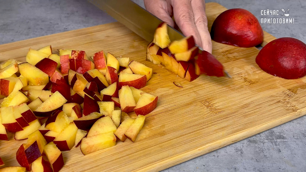 Начать стоит с подготовки нектаринов. Их нужно нарезать на небольшие кусочки и отложить в сторону для последующей сборки десерта.