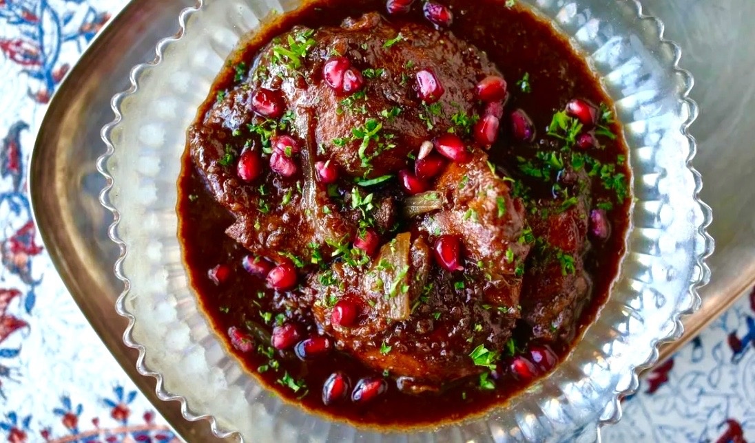 Утку нарезать, обжарить и томить вместе с луком и специями. В конце добавить гранатовый сок и тушить до готовности. Подавайте это изысканное блюдо с зернами граната!