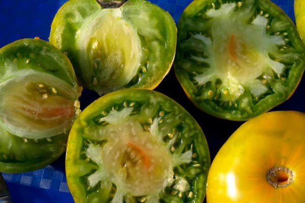 - Плод: округлая форма с весом от 250 до 900 г. Зрелые помидоры привлекают внимание своей красивой окраской — от зеленоватого к желто-зеленому с темными полосками.
